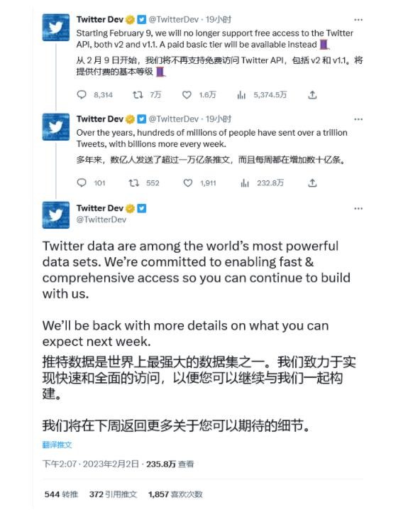 Twitter 官方開(kāi)發(fā)者賬號在推文中表示:“我們宣布自 2 月 9 日開(kāi)始,不再支持免費訪(fǎng)問(wèn) v1.1 和 v2 版本的 Twitter API,后續我們將推出付費的基礎套餐”。