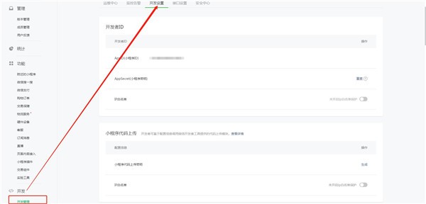 2.進(jìn)入到小程序后臺在左側菜單中找到開(kāi)發(fā)中的開(kāi)發(fā)管理,點(diǎn)擊進(jìn)入就可以看到AppSecret生成頁(yè)面了。