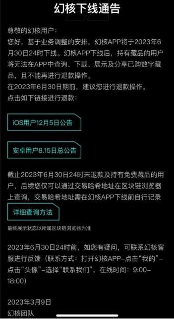 幻核 APP 下線(xiàn)后,持有餐品的用戶(hù)將無(wú)法在 APP 中查詢(xún)、下載、展示及分享已購數字藏品,且不能再進(jìn)行退款操作。