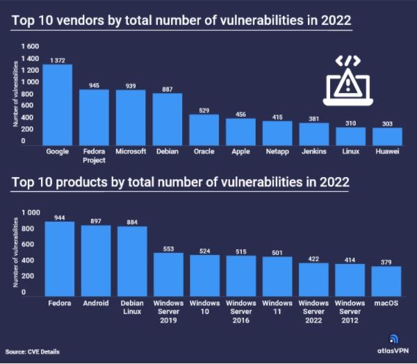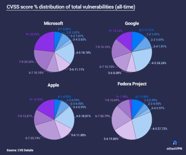 根據安全公司 Atlas 公布的最新報告,谷歌、Fedora、微軟產(chǎn)品存在的漏洞數量最多。蘋(píng)果公司以 456 個(gè)漏洞位居第六、華為以 303 個(gè)漏洞位居第十。