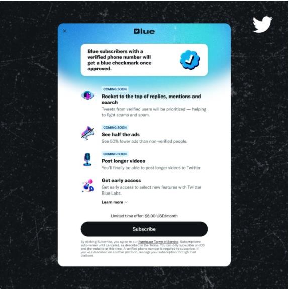 Twitter本周已推出Twitter Blue訂閱服務(wù) 每月8美元 15:00:28