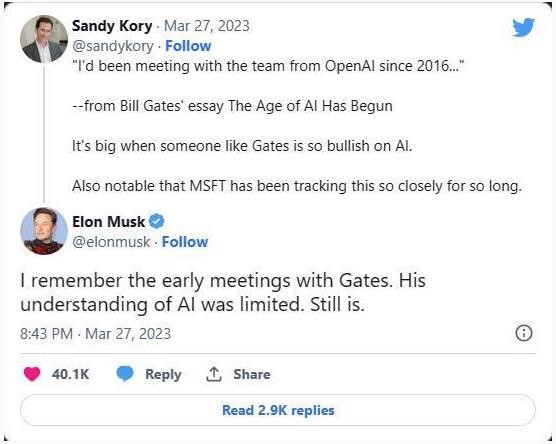 隨后,馬斯克在推特上跟帖了這條推文。他寫(xiě)道:“我記得與蓋茨的早期會(huì )面。他對 AI 的理解十分有限?,F在依然如此。”