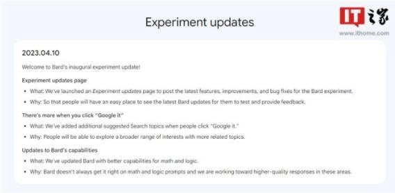 Bard 是谷歌今年早些時(shí)候發(fā)布的一個(gè)“實(shí)驗性的對話(huà)式人工智能服務(wù)”,目前已經(jīng)在美國和英國開(kāi)放使用。谷歌表示,Bard 的模型正在不斷調整,但如果沒(méi)有一個(gè)集中的地方來(lái)展示它的變化,用戶(hù)很難知道它到底能做什么。因此,谷歌創(chuàng )建了這個(gè)“實(shí)驗更新”頁(yè)面,用戶(hù)可以在這里找到關(guān)于 Bard 最近的更新信息,包括新功能和錯誤修復。每個(gè)更新都包括了“是什么”和“為什么”的說(shuō)明。對于這個(gè)頁(yè)面本身,谷歌說(shuō)它是為了讓“用戶(hù)有一個(gè)地方來(lái)方便地查看最新的 Bard 更新,并進(jìn)行測試和反饋”。
