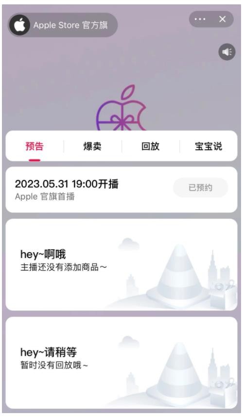 在當前直播頁(yè)面,有預告、爆賣(mài)、回放、寶寶說(shuō)(用戶(hù)發(fā)言)等頻道,目前暫未有具體的商品信息。