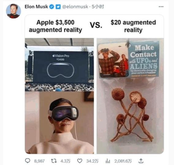 馬斯克的意思指的是,相較于蘋(píng)果 Vision Pro 提供的虛幻世界,魔幻菇的幻覺(jué)更加真實(shí),具有沉浸式體驗感,而且價(jià)格更為友好。