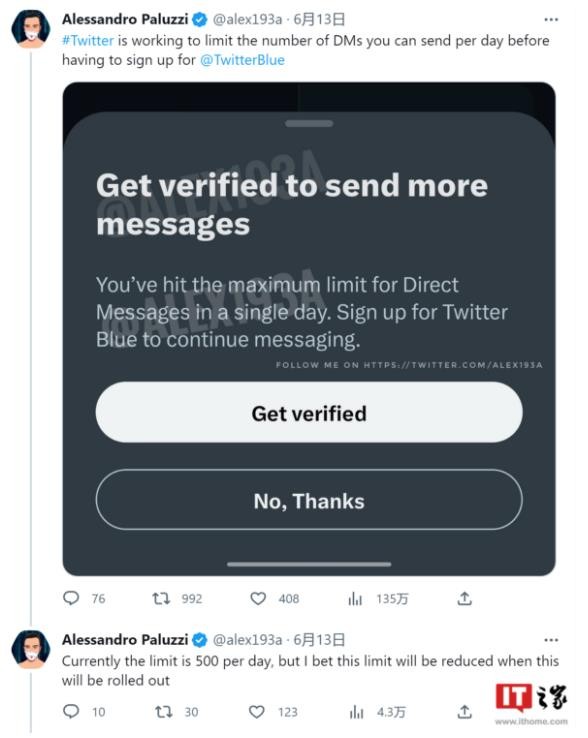 據可靠爆料人 Alessandro Paluzzi 透露,為推動(dòng) Blue 付費用戶(hù)的增加,推特(Twitter)正計劃進(jìn)一步限制普通用戶(hù)每日可發(fā)送的私信數量,而付費用戶(hù)可以無(wú)限發(fā)送。Alessandro Paluzzi 經(jīng)常逆向拆解代碼來(lái)獲得可靠的爆料信息,因此其消息可信度較高。