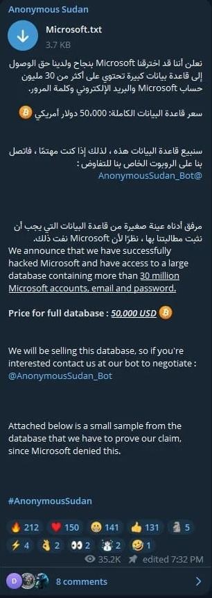 微軟今年 6 月承認旗下 OneDrive、Microsoft 365、Azure 云服務(wù)受到黑客 DDoS 攻擊,導致服務(wù)反復中斷。一個(gè)名為 Anonymous Sudan 的黑客組織日前宣稱(chēng),該攻擊行動(dòng)由他們所負責。該黑客組織同時(shí)聲稱(chēng),他們已經(jīng)黑入了微軟服務(wù)器,并從中獲取了 3000 萬(wàn)條用戶(hù)信息數據。