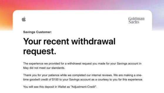 蘋(píng)果和高盛為了補償這些提現困難的用戶(hù),表示一次性補償 100 美元,目前尚不清楚有多少 Apple Savings 用戶(hù)收到了這些“善意信貸”。