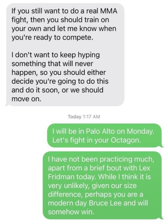 馬斯克回復稱(chēng):“周一我將在帕洛阿爾托,讓我們在你的八角場(chǎng)上戰斗吧!我沒(méi)怎么練習,不過(guò)我覺(jué)得自己獲勝的可能性很小。鑒于我們的身材差異,也許你是現代版的李小龍,你會(huì )贏(yíng)的!”