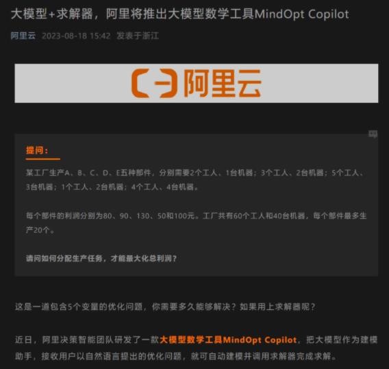據阿里云官方公眾號表示,近日,阿里決策智能團隊研發(fā)了一款大模型數學(xué)工具 MindOpt Copilot,把大模型作為建模助手,接收用戶(hù)以自然語(yǔ)言提出的優(yōu)化問(wèn)題,就可自動(dòng)建模并調用求解器完成求解。