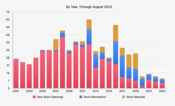 根據 Facades 應用開(kāi)發(fā)者 Michael Steeber 發(fā)布的最新博文,截至今年 8 月,蘋(píng)果公司今年開(kāi)設了 8 家新店。而在 2022 年全年蘋(píng)果才開(kāi)設了 6 家新店;2021 年全年開(kāi)設了 8 家新店。