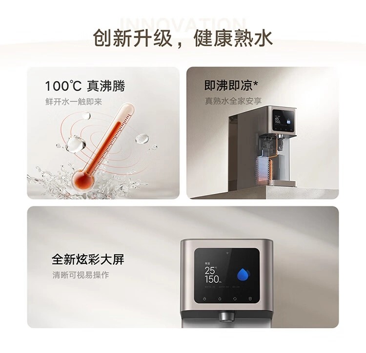 據介紹,這款產(chǎn)品配備 4L 原水箱 + 1.8L 廢水箱,擁有全新炫彩大屏,采用雙芯 6 級精濾,可實(shí)現原廢完全隔離,支持 100℃真沸騰、即沸即涼、主水路無(wú)雙酚 A、出水水路無(wú)硅膠、UV 燈持久殺菌。