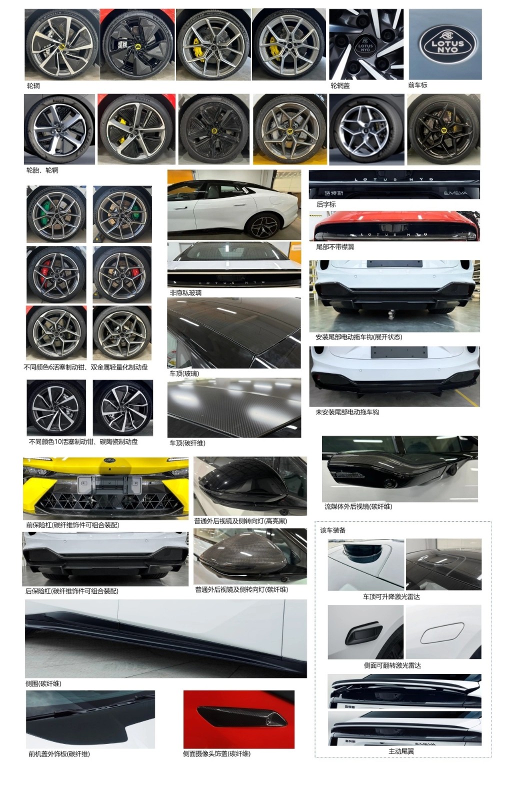 申報圖片顯示,路特斯 Emeya 純電超跑提供黑白兩種配色,車(chē)頂、流媒體外后視鏡、側圍、前機蓋外飾板、前后保險杠等均提供碳纖維套件。此外,該車(chē)車(chē)頂配備可升降激光雷達,側面配備可翻轉激光雷達,車(chē)尾配備主動(dòng)尾翼。