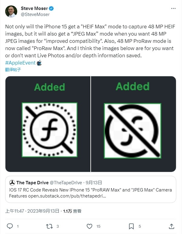 MacRumors 的編輯 Steve Moser 近日在 X(推特)上發(fā)布推文,表示除了“HEIF MAX”選項之外,蘋(píng)果在 iPhone 15 和 iPhone 15 Pro 系列機型中還引入了“JPEG MAX”選項,并會(huì )下放到 iPhone 14 Pro 機型中。