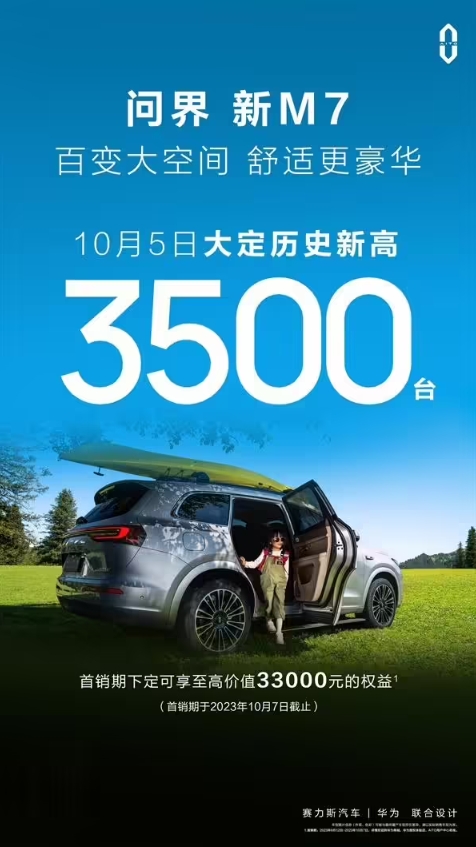 問(wèn)界新 M7 車(chē)型自 9 月 12 日正式上市以來(lái),日均大定超過(guò) 1500 輛,整個(gè) 9 月的大定總量達到了 30000 輛。此外,新車(chē)首銷(xiāo)期下訂可享至高 33000 元權益,首銷(xiāo)期將于 10 月 7 日結束。