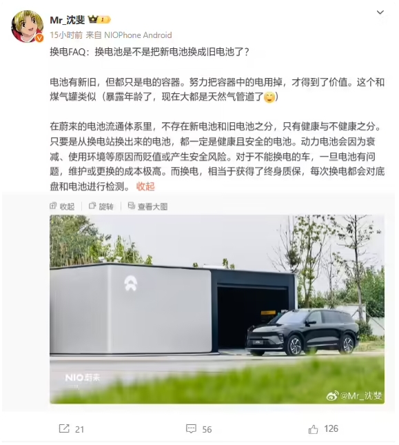 蔚來(lái)能源高級副總裁 @Mr_沈斐 昨晚在微博發(fā)文,對部分車(chē)主關(guān)心的問(wèn)題進(jìn)行解答。