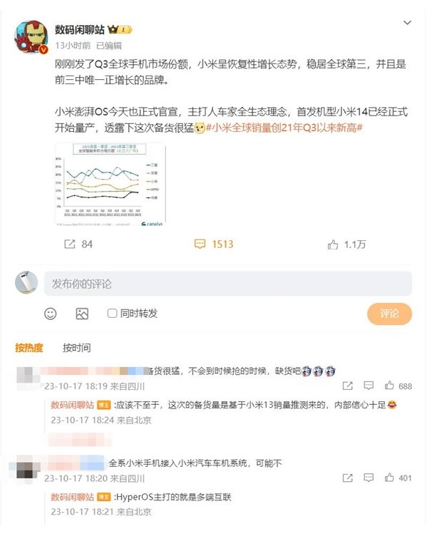 博主數碼閑聊站透露,小米14備貨量很猛,內部對小米14這款旗艦信心十足。