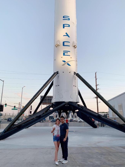 ▲洪力德和妻子在 Space X 的火箭前留影