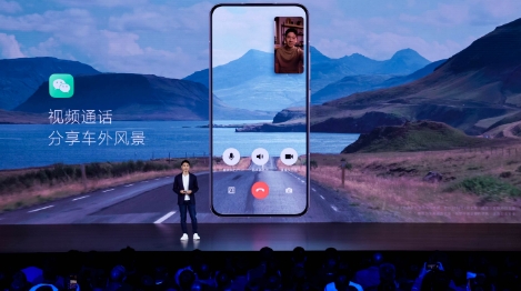 發(fā)布會(huì )上,金凡演示調用汽車(chē)攝像頭進(jìn)行視頻通話(huà)小米