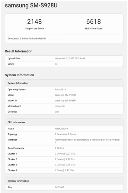 值得注意的是,驍龍8 Gen3還有一款高頻版本,現在它出現在了Geekbench跑分網(wǎng)站上,測試設備是三星Galaxy S24 Ultra,設備型號是SM-S928U。
