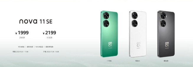 華為 nova 11 SE 今日正式發(fā)售,提供 256GB、512GB 兩種存儲版本以及 11 號色、雪域白、曜金黑三種配色,分別為 1999 元和 2199 元。