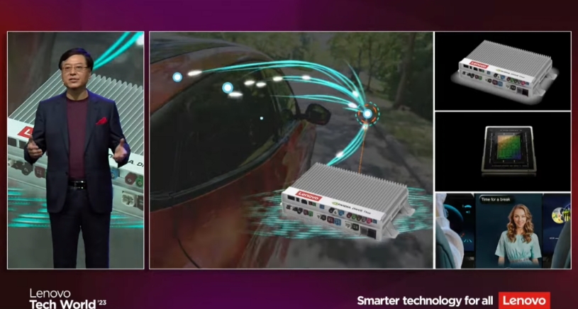 楊元慶在演講時(shí)介紹了聯(lián)想車(chē)計算的產(chǎn)品布局,他指出,未來(lái)智能汽車(chē)更像是輪子上的超級 PC,對汽車(chē)性能標準的衡量也從馬力變成了算力,聯(lián)想車(chē)計算的域控產(chǎn)品將支持智能座艙、自動(dòng)駕駛和智慧屏幕等,基于汽車(chē)場(chǎng)景的大模型也將化身智能伴侶,了解用戶(hù)、幫助用戶(hù)和陪伴用戶(hù)。