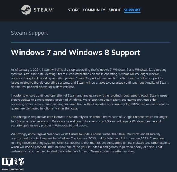 距離 2024 年的元旦,已經(jīng)不到一個(gè)星期了。Steam 日前通過(guò)官方支持頁(yè)面發(fā)布通知:自 2024 年 1 月 1 日起,Steam 將正式停止支持 Windows 7、Windows 8 和 Windows 8.1 操作系統。