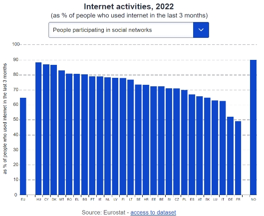 2022年,90%的歐盟人口報告說(shuō)他們在過(guò)去3個(gè)月內使用過(guò)互聯(lián)網(wǎng)。仔細研究一下他們在網(wǎng)上的行為就會(huì )發(fā)現,互聯(lián)網(wǎng)主要用于與他人交流,例如收發(fā)電子郵件(86%)和即時(shí)通訊(80%)。