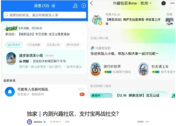 支付寶于近期內測一項名為“興趣社區”的社交功能,定位是發(fā)現有趣找到玩伴,用戶(hù)可以在社區內體驗潮酷生活,結識同頻興趣玩伴。目前,該功能還處于內測階段。