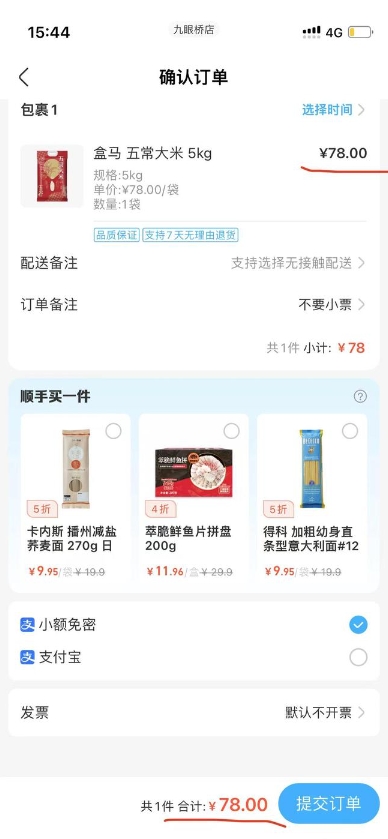 對于不少網(wǎng)友所詬病的,下單購買(mǎi)有獨立包裝的大米、水果、牛奶等商品仍被收取包裝費的情況,在盒馬 app 上測試獨立下單了一袋 5kg 包裝的大米,并沒(méi)有被收取包裝費。