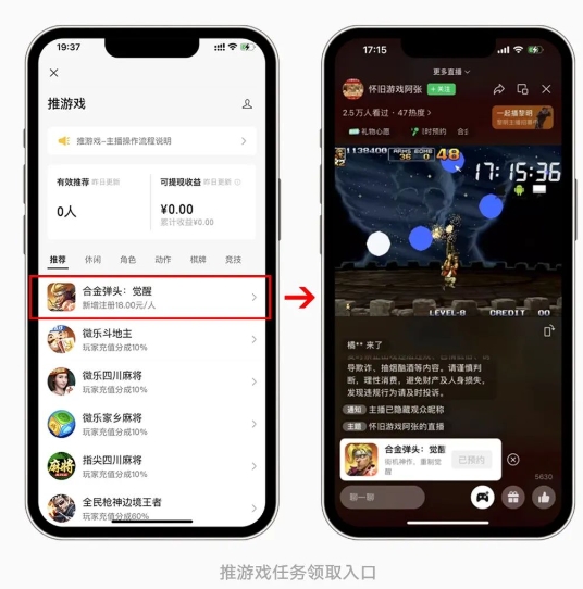 2023 年 5 月,微信“視頻號直播推游戲”功能灰度上線(xiàn),游戲廠(chǎng)商在視頻號上架游戲推薦任務(wù),視頻號主播可在任務(wù)廣場(chǎng)領(lǐng)取任務(wù);直播游戲時(shí),主播進(jìn)入副設備直播間 / 視頻號助手 web 端,點(diǎn)擊“一起玩”即可推送已經(jīng)領(lǐng)取的游戲任務(wù),引導粉絲預約、下載、啟動(dòng)游戲,實(shí)現私域流量變現。