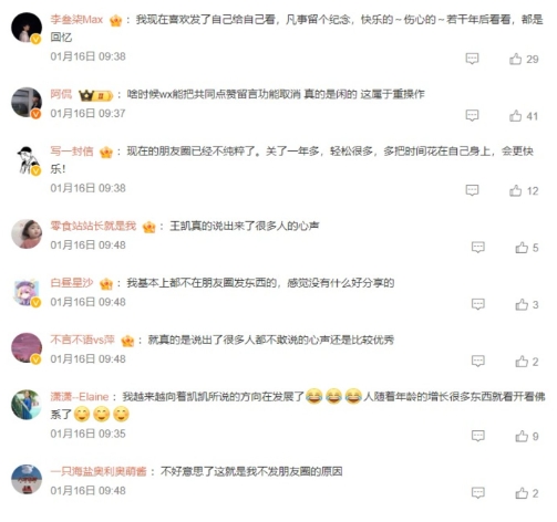 但隨著(zhù)微信好友數量從一二十個(gè),增長(cháng)到一兩千個(gè)時(shí),這個(gè)列表里絕大部分人其實(shí)并不是自己的“朋友”,朋友圈也就變得越來(lái)越混沌、復雜,變得更具功利屬性的一種社交工具了,所以王凱選擇抽身而去,不再發(fā)布,也不再關(guān)注。這也得到了許多網(wǎng)友的認可與共情。