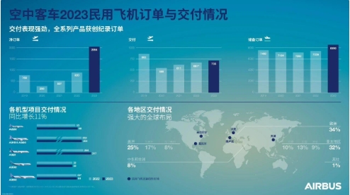 空中客車(chē) 2023 年向全球 87 家客戶(hù)交付了 735 架民用飛機,同比增長(cháng) 11%;新增訂單 2319 架(凈訂單 2094 架),其中包括 1835 架 A320 系列飛機和 300 架 A350 系列飛機。