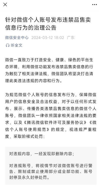 微信安全中心:個(gè)人賬號不得發(fā)布、展示、傳播各類(lèi)違禁品售賣(mài)信息,最嚴重面臨永久封號處罰 09:09:44