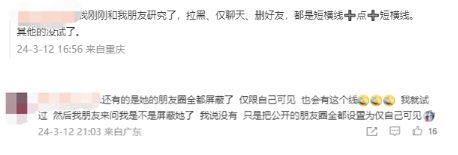 還有人指出“好像和系統有關(guān),設置的“僅聊天”和“不讓他看”,安卓顯示的是長(cháng)線(xiàn),蘋(píng)果顯示是短線(xiàn)。”