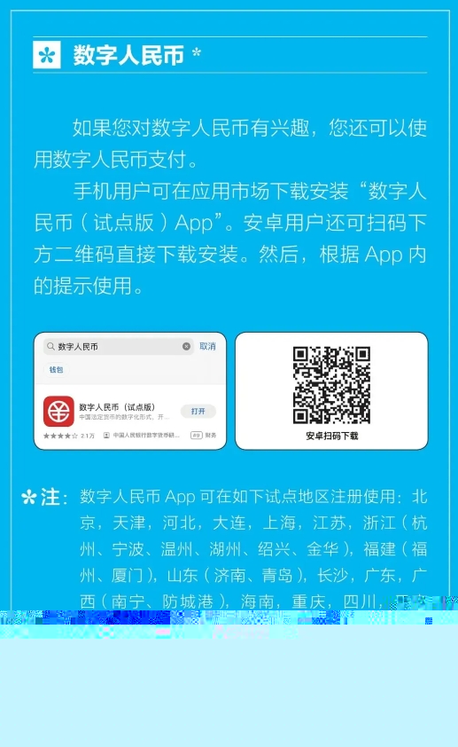 外籍來(lái)華人員還可使用數字人民幣進(jìn)行支付,該服務(wù)目前已在如下試點(diǎn)地區開(kāi)放: