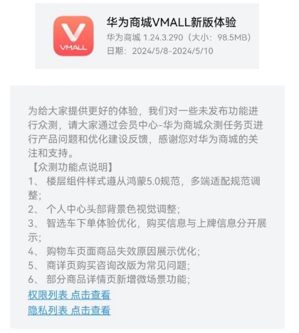 華為商城 App 開(kāi)啟眾測更新體驗,版本號為 1.24.3.290,安裝包大小 98.5MB。