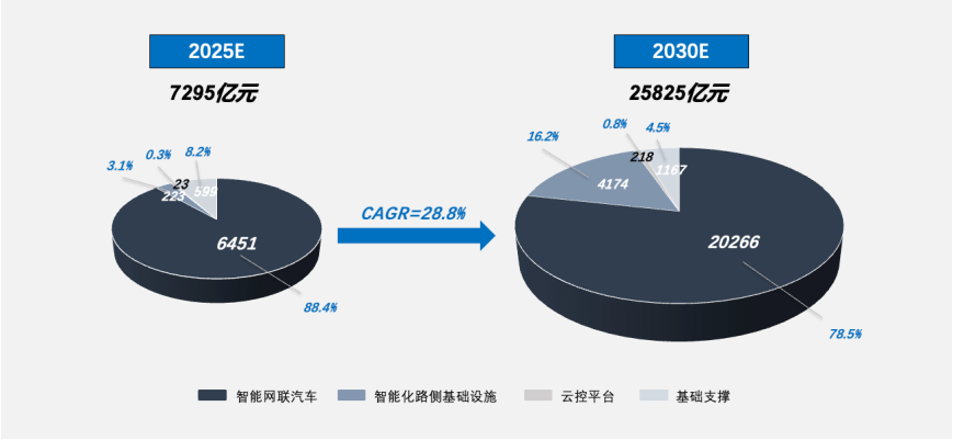 中國汽車(chē)工程學(xué)會(huì )研究顯示,預計2025年、2030年車(chē)路云一體化智能網(wǎng)聯(lián)汽車(chē)產(chǎn)業(yè)產(chǎn)值增量為7295億元、25825億元,增長(cháng)勢頭強勁。另?yè)惖锨罢爱a(chǎn)業(yè)研究院報告,2030年中國智能網(wǎng)聯(lián)車(chē)市場(chǎng)規模有望突破5萬(wàn)億元,車(chē)路云一體化相關(guān)市場(chǎng)規模超14萬(wàn)億元。