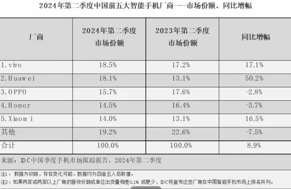 近日,國際數據公司(IDC)發(fā)布了最新手機季度跟蹤數據,報告顯示,2024年第二季度,中國智能手機市場(chǎng)出貨量達到7158萬(wàn)臺,同比增長(cháng)8.9%,延續增長(cháng)勢頭。其中,在vivo、OPPO等廠(chǎng)商的推動(dòng)下,Android市場(chǎng)同比增長(cháng)11.1%。