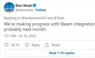 據報道,特斯拉 CEO 埃隆·馬斯克發(fā)推稱(chēng),整合游戲平臺 Steam 的工作取得進(jìn)展,下個(gè)月可能就會(huì )演示?! ?shí)際上,特斯拉已通過(guò) Ar