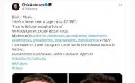 馬斯克周二在回應一位X用戶(hù)的提議時(shí)表示,和扎克伯格來(lái)一場(chǎng)籠中辯論賽也是個(gè)不錯的注意?! ED 演講創(chuàng )始人克里斯·安德森(Chris An