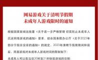網(wǎng)易游戲官方發(fā)布《關(guān)于清明節假期未成年人游戲限時(shí)的通知》。在清明節假期當天,未成年人玩家只有晚上 20:00 至 21:00 一小時(shí)玩游